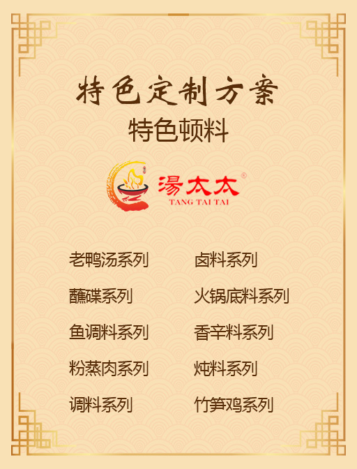 重慶湯太太提供特色湯料,這里你可以找到屬于自己的口味、產品、服務,我們根據不同的客戶我們制定了一套方案,根據客戶需求可定制產品的大小分量以及特殊要求。